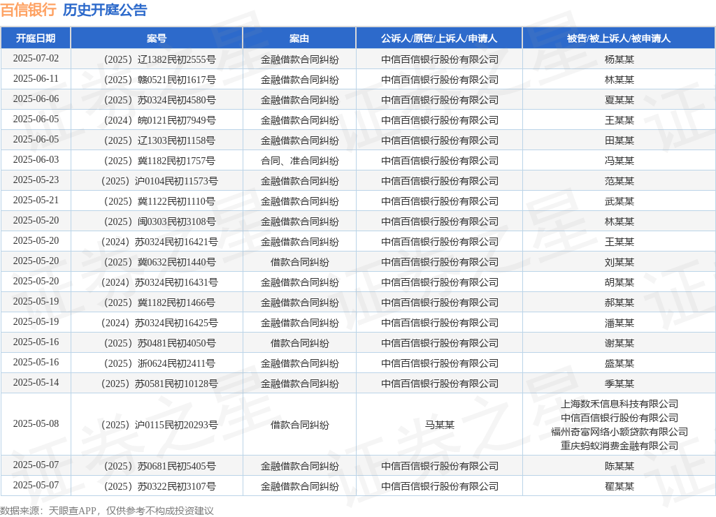 案号:(2025)苏0581民初10128号审理法院:常熟市人民法院案由:金融借款合同纠纷当事人信息: 原告/上诉人:中信百信银行股份有限公司 被告/被上诉人:季某某开庭日期:2025年5月14日根据统计,近一年内以中信百信银行股份有限公司为当事人的历史开庭公告有340则,其中案由为“金融借款合同纠纷”的公告以299则居首,其次为“借款合同纠纷”有27则,“小额借款合同纠纷”有3则。历史开庭公告(前20条)如下: