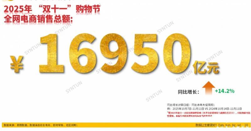 星图数据显示,2025年双11全网电商销售总额为16950亿元,同比增长14.2%。其中综合电商平台(天猫、京东、抖音等)双11销售额为16191亿元,同比增长12.3%;即时零售(美团闪购、淘宝闪购、京东秒送等)双11销售额为670亿元,同比增长138.4%。